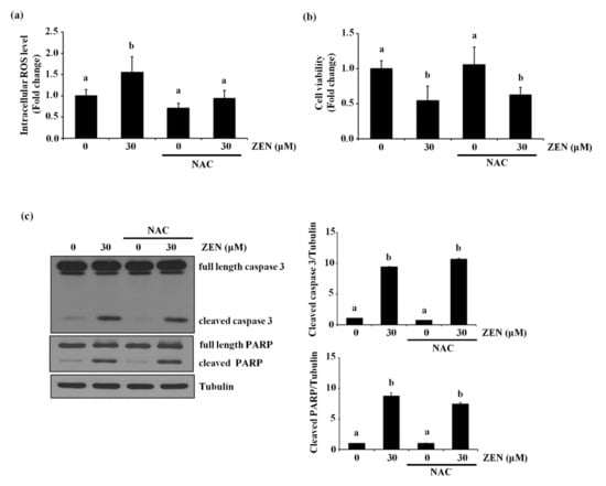 ZEN induces EC apoptosis in an ROS-independent manner. After pretreatment with 5 mM of NAC for 3 h, BAECs were incubated with 30 µM of ZEN for 24 h. (a) The intracellular ROS production from the BAECs was measured using DCF-DA. (b) Cell viability was measured by using the MTT assay. (c) The protein expression of cleaved caspase 3 and PARP relative to tubulin was quantified using western blot analyses. The plots depict the mean fold changes relative to the control (±SD) from at least four independent experimental trials. The different alphabetical letters refer to significant difference (p < 0.05) among groups, which were determined by one-way ANOVA followed by Tukey’s multiple comparisons.