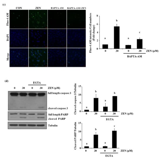 Cytosolic Ca2+ is involved in ZEN-induced EC apoptosis. After pretreatment with 2 µM of BAPTA-AM (a–c) or 0.1 mM of EGTA (d) for 1 h, BAECs were incubated with 30 µM of ZEN for 24 h. (a) Cell viability was measured using the MTT assay. (b,d) The protein expression of cleaved caspase 3 and PARP relative to tubulin was quantified using western blot analyses. The plots depict the mean fold changes relative to the control (±SD) from at least four independent experimental trials. (c) Visualization of cytosolic Ca2+ in the BAECs stained with the membrane-permeable Ca2+ indicator dye Fluo-4 AM using a confocal microscope (100×). The different alphabetical letters refer to significant difference (p < 0.05) among groups, which were determined by one-way ANOVA followed by Tukey’s multiple comparisons.