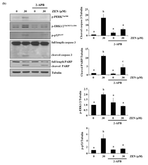 ZEN was reported to increase ER stress to induce apoptosis [,,,] and the ER is the major organelle responsible for storing and releasing Ca2+ []. Under our conditions, we examined whether ER stress was involved in the effects of ZEN on BAEC apoptosis. It has been known that when ER stress is induced, the phosphorylation of PERK is increased, which then activates the PERK/eIF2α-dependent pro-apoptotic transcriptional signal to induce apoptosis [,]. For this reason, we chose the level of phosphorylation of PERK as a marker of ER stress. As expected, ZEN increased the phosphorylation of PERK, which is decreased by pretreatment with 4-PBA, an ER stress inhibitor (Figure 8a). However, cleavage of caspase 3 and PARP induced by ZEN was not prevented with 4-PBA, indicating that ER stress is unlikely to be involved in the ZEN-induced apoptosis of BAECs. Lastly, we treated the BAECs with 2-APB, an ER Ca2+ channel inhibitor, and found that 2-APB significantly prevented the effects of ZEN on EC apoptosis (Figure 8b). Based on these findings, we concluded that ZEN induces BAEC apoptosis by promoting Ca2+ release from ER to elevate cytosolic Ca2+, which subsequently activates ERK1/2/p53/caspase 3 apoptotic pathway.