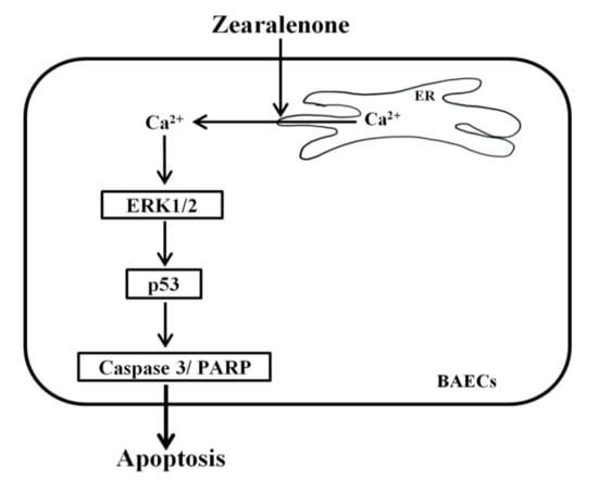 In conclusion, our study is the first to demonstrate that ZEN induces EC apoptosis by activating a signaling axis of cytosolic Ca2+/ERK1/2/p53, as illustrated in Figure 9. This molecular mechanism represents a potential risk of ZEN exposure in relation to vascular health in animals and humans.