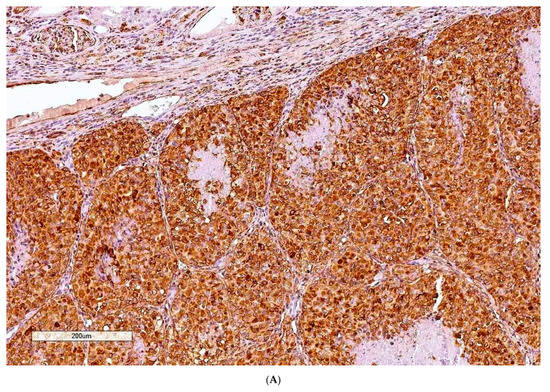 (A) Case 2, CK MNF 116 (200×). (B) Control (human tonsil), CK MNF 116 (200×).
