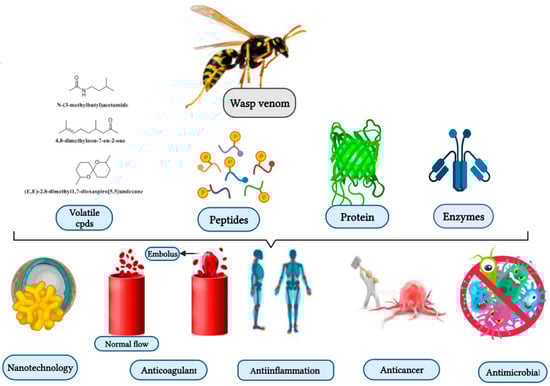 Abd El-Wahed, A.; Yosri, N.; Sakr, H.H.; Du, M.; Algethami, A.F.M.; Zhao, C.; Abdelazeem, A.H.; Tahir, H.E.; Masry, S.H.D.; Abdel-Daim, M.M.; et al. Wasp Venom Biochemical Components and Their Potential in Biological Applications and Nanotechnological Interventions. Toxins 2021, 13, 206. https://doi.org/10.3390/toxins13030206