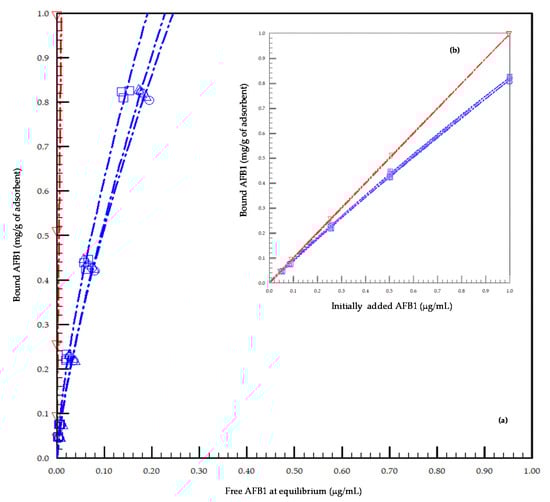 Concentrations of bound vs. free aflatoxin B1 (AFB1) evaluated at pH 3.0 using three independent batches of yeast cell wall-based adsorbent (YCW) or one hydrated sodium calcium aluminosilicate (HSCAS). (a) The concentration of free AFB1 at equilibrium is expressed as µg/mL, and the corresponding bound concentration of AFB1 is expressed as mg/g for each adsorbent used: YCW (open blue squares, circles, triangles) and HSCAS (red triangles) at pH 3.0; ((b) subfigure window) the concentration of the initially added AFB1 is expressed as µg/mL, and the corresponding bound concentration of AFB1 at equilibrium is expressed as mg/g for each adsorbent used: YCW (open blue squares, circles, triangles) and HSCAS (red triangles) at pH 3.0. All replicate values (three replicates per concentration tested for each individual product) are displayed in the graphic. Adsorption curves were fitted using the Freundlich equation.