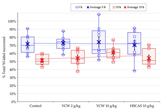 Total recovery of the 3H-label from 3H-aflatoxin B1 (3H-AFB1) expressed as the percentage of the initial dose administered in all samples analyzed after the oral administration of AFB1-contaminated diet to rats in the presence or absence of yeast cell wall-based adsorbent (YCW) or hydrated sodium calcium aluminosilicate (HSCAS) at different concentrations. All replicate (open circles/squares) and average values (cross) are displayed in the graphic: (1) Box and whisker chart, as well as median (horizontal line), average (cross) and quartiles calculations (box); and (2) the regression curve of the average values shows the magnitude of the recovery. Bars (in black) in boxes correspond to the standard errors of the mean of the replicate rats. The study was performed initially on n = 64 rats, or 16 rats per treatment. At 5 h (in blue), n = 9 rats for the 10 g/kg YCW treatment and n = 8 for the rest of the treatments were collected for analysis; At 10 h (in red), the reminder rats (4 rats were excluded due to morbidity/mortality issues before the start of the main experimental study period) per treatments were collected for analysis, n = 6 in the control group and n = 7 in each of the adsorbent treated groups.