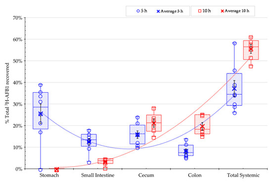 Distribution of the 3H-label from 3H-aflatoxin B1 (3H-AFB1) in rats at 5 (in blue) and 10 h (in red) after administration of the control treatment. Figures indicate the percentages of the total radiolabeled AFB1 recovered from digesta in different intestinal compartments and the total systemic radiolabeled AFB1 (the sum of radioactivity in the plasma, liver, and kidney). All replicate (open circles) and average values (cross) are displayed in the graphic: (1) Box and whisker chart, as well as median (horizontal line), average (cross), and quartiles calculations (box); and (2) the regression curve of the average values shows the magnitude of the recovery. Bars (in black) in boxes correspond to standard errors of the mean of the replicate rats. Control treatment initially comprised 16 rats. The integrality of each gastrointestinal compartiment was collected for: n = 8 rats at 5 h; the reminder n = 6 rats at 10 h (two rats were excluded from this analysis due to morbidity/mortality issues before the start of the main experimental study period) for analysis.