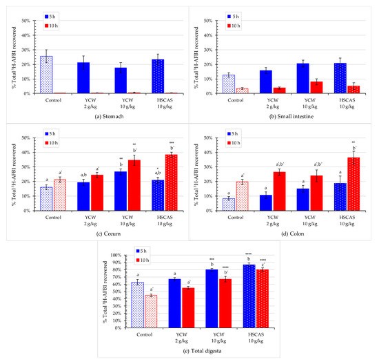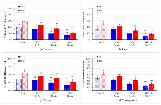 The effect of mycotoxin binders on the residual level of the 3H-label from 3H-aflatoxin B1 (3H-AFB1) in digesta at 5 (in blue) and 10 h (in red) after toxin administration with or without the addition of yeast cell wall-based adsorbent (YCW) at two concentrations or hydrated sodium calcium aluminosilicate (HSCAS). Panels (a–d) show the percentage of recovered radioactivity found in the (a) plasma, (b) liver, (c) kidney, and (d) total systemic. Bars in columns correspond to standard errors of the mean of the replicate rats. Significant differences between the control and amended feeds are indicated by asterisks as follows: * 0.01 ≤ p < 0.05; ** 0.001 ≤ p <0.01; *** 0.001 ≤ p < 0.001; **** p < 0.0001 as analyzed using Dunnett’s post-hoc test. In addition, pairwise comparison was tested by Tukey’s post-hoc test; different letters indicate significant difference between treatments within a sampling time point. Study was performed on initially n = 64 rats or 16 rats per treatment. At 5 h, n = 9 rats for the 10 g/kg YCW treatment and n = 8 for the rest of the treatments were collected for analysis; At 10 h, the reminder rats (four rats were excluded due to morbidity/mortality issues before the start of the main experimental study period) per treatments were collected for analysis, n = 6 in the control group and n = 7 in each of the adsorbent treated groups. Integrality of each digestive compartiment and systemic tissue was collected for each rat.