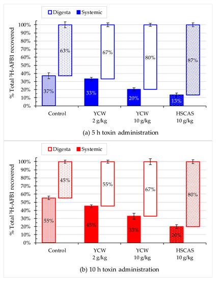 Overall, both adsorbents significantly reduced the total systemic accumulation of AFB1 from ~47% in the control down to ~20% and ~15% after 5 h of exposure and from ~55% down to ~30 and ~20% after 10 h of exposure a following dietary treatments with YCW and HSCAS, respectively (Figure 5d).