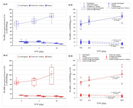 Dose response evaluation measured from the disintegration per minute of the 3H-label from 3H-aflatoxin B1 (3H-AFB1) normalized per gram of digesta or tissue collected (×1000 DPM/g) or per milliliter of plasma (×1000 DPM/mL) in rat at (a-1,a-2) 5 h (blue) and (b-1,b-2) 10 h (red) after the toxin administration with 0, 2, and 10 g/kg dose of yeast cell wall-based adsorbent (YCW). All data points measured are reported on: (1) Box and wiskers chart, as well as median (horizontal line), average (cross), and quartile calculations (box); and (2) the regression curve on the average values evaluating the direction and magnitude of the effect relative to the YCW dose. This study was performed initially on 16 rats per treatment. At 5 h, n = 9 rats for the 10 g/kg YCW treatment and n = 8 for the rest of the treatments were collected for analysis; at 10 h, the reminder rats (three rats were excluded from this analysis due to morbidity/mortality issues before the start of the main experimental study period) per treatments were collected for analysis, n = 6 in the control group and n = 7 in each of the YCW treated groups. Integrality of each digestive compartiment and systemic tissue was collected for each rat. All replicate (open circles/squares) and average values (cross) are displayed in the graphic.