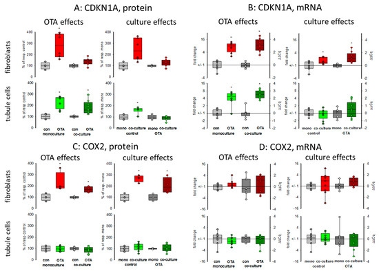 It has been shown that cyclooxygenase 2 (COX2) protein as well as mRNA levels are increased during kidney failure [22]. As shown in Figure 2C,D and Figure 3, only in fibroblasts the protein expression was increased by OTA exposure. In addition, in the presence of tubule cells, COX2 protein expression was enhanced in untreated as well as in OTA-exposed cells, demonstrating a clear influence of tubule cells. The mRNA expression, however, was not influenced by OTA and a very slight effect of co-culture occurred by OTA exposure. In contrast, in tubule cells, the mRNA and protein expression of COX2 was completely independent from OTA or the presence of fibroblasts. That shows that concerning COX2 tubule cells can influence fibroblasts but fibroblasts have no influence on tubule cells.