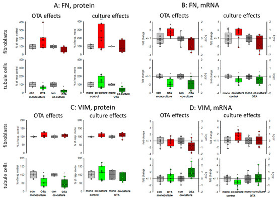 Vimentin is a protein whose abundance increases when epithelial-to-mesenchymal transition (EMT) takes place and EMT development can lead to kidney failure [23]. Therefore, the OTA-dependent alteration of vimentin mRNA and protein expression was determined in mono- and co-culture conditions. As shown in Figure 3 and Figure 4C,D, 48 h exposure of tubule cells to 100 nM OTA led to a lower abundance of vimentin protein both under mono- and co-culture conditions. However, in the presence of fibroblasts the vimentin protein expression was independent from culture conditions. The expression of mRNA coding for vimentin was almost not altered neither by OTA nor by culture conditions with the exception that OTA exposure in co-culture showed a slight increase. In fibroblasts, the vimentin protein expression was completely independent from OTA exposure as well as from the presence of the tubule cells. In addition, vimentin-coding mRNA expression was almost not altered.