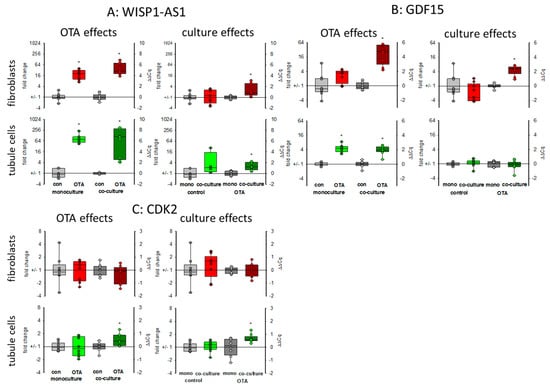 Effects of OTA and/or culture conditions on expression of RNA coding for WISP1-AS1 (A), GDF15 (B), and CDK2 (C). Cells were cultivated either in mono- or in co-culture and exposed to 100 nM OTA for 48 h. n = 3, n = 4–9. * indicates a p < 0.05 to non-OTA-exposed cells (comparing the OTA effects, resp. left side) or to cells in mono-culture (comparing culture effects, resp. right side).