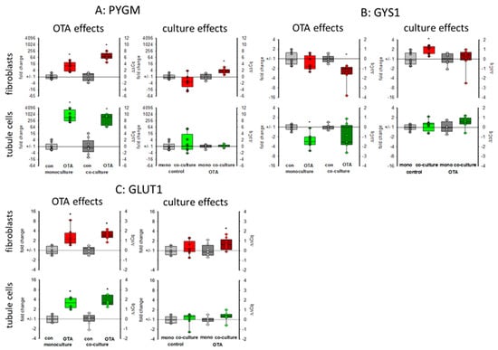 The kidney is also involved in glucose homeostasis and can provide the body with glucose either by gluconeogenesis or by mobilizing glycogen stores [27]. Glycogen phosphorylase (PYGM) plays a role in the decomposition of glycogen stores, thereby mobilizing glucose [28]. As seen in Figure 6A, 48 h exposure to 100 nM OTA led to a marked increase in the expression of the mRNA coding for glycogen phosphorylase, especially in the tubule cells. However, in tubule cells this increase was not dependent on culture condition whereas in fibroblasts the OTA-induced expression was higher in the presence of tubule cells as compared to the condition without tubule cells. Glycogen synthase 1 (GYS1) catalyzes the opposite reaction and whereas the expression of the phosphorylase was upregulated, the expression of the synthase was down regulated by OTA in tubule cells and in fibroblasts in co-culture (Figure 6B). This indicates a glucose-mobilizing effect of OTA. Interestingly, the mRNA expression of the glucose transporter GLUT1 (SLC2A1) was upregulated by OTA, too (Figure 6C), underlining the idea of an enhanced glucose demand due to OTA exposure maybe due to impaired mitochondria.