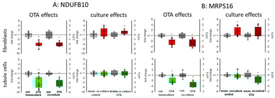 There are indications that OTA exposure can lead to a decrease of the mitochondrial potential in kidney cells [24] showing that mitochondrial function may be influenced by OTA exposure, which might be additionally influenced by the presence of fibroblasts. Therefore, representative of other RNA coding for mitochondrial proteins, we show here the expression of the mRNAs coding for NDUFB10 and MRPS16. NDUFB10 codes for the mitochondrial NADH:ubiquinone oxidoreductase subunit B10, which is a part of the mitochondrial respiratory complex I and highly expressed in heart and kidney (NCBI gene. Available online: https://www.ncbi.nlm.nih.gov/gene/4716 (accessed on 17 March 2021)). The MRPS16 gene codes for the mitochondrial ribosomal protein S16, which plays a role in mitochondrial protein synthesis. As shown in Figure 7, 24 h OTA exposure led in both cell types to a decreased expression of both mRNAs. In tubule cells, the decreased expression of NDUFB10 gene was not influenced by the presence of fibroblasts, whereas in fibroblasts the OTA-induced reduction of NDUFB10 expression was slightly rescued in the presence of tubule cells (Figure 7A). In tubule cells, the already lowered expression of the gene coding for the mitochondrial ribosomal subunit by OTA was additionally lower in the presence of fibroblasts, whereas in fibroblasts the presence of tubule cells led to a slightly higher expression of MRPS16 mRNA (Figure 7B). This shows that mitochondrial function can be affected by OTA but that the OTA effect can additionally be modified when the two cell types are close together.