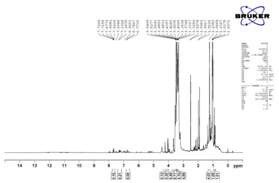 The 1H NMR analysis of metabolic compounds produced by C. fumosorosea isolate SP502 shows a high resonance band in aliphatic (0.9–1.4 ppm), allylic, pyrrolidine ring and NeCH (2.0–2.6 ppm and 2.1–3.5 ppm), an ether linkage (3.5–4.3 ppm), and amide proton (7.3–7.8 ppm) regions. These findings further confirm the production of metabolic compounds detected through LC-MS analysis (Figure 3).