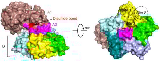 Figure 1. The structure of Shiga toxin: an A subunit, which is cleaved into an enzymatic piece A1 (colored brown) and a linker piece A2 (colored magenta), and five B subunits (PDB: 4M1U). The disulfide bond connecting A1 and A2 pieces is colored red. In the bottom view (right panel), three receptor binding sites on one B subunit (colored yellow) are shown.