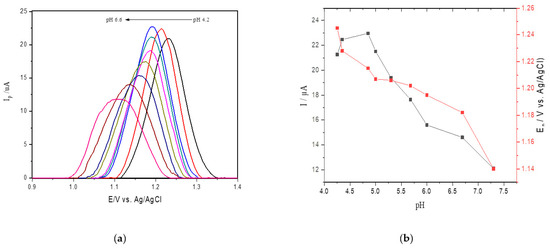 (a) Square wave voltammetry (SWV) for oxidation of 25 μM of adenine at different pH values (4.2–6.6) at the screen printed electrodes (SPEs) in acetate buffer; (b) anodic peak current obtained changing pH values.