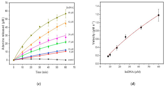(a) SWV with varying concentrations of adenine up to 80 µM (pH 4.6) in the hsDNA sample. The arrow represents increasing adenine concentrations; (b) analytical curve of adenine; (c) progressive curve of adenine released after depurination reaction from hsDNA (8–60 µM) catalyzed by ricin at 100 ng/mL; (d) kinetic curve fitted for ricin catalysis on the hsDNA substrate.