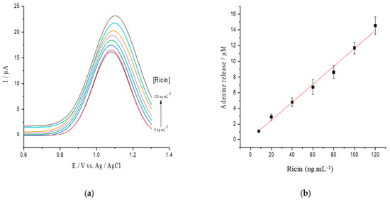 To verify that the depurination reaction and adenine release are related to the ricin concentration, a calibration curve was tested between 0 and 120 ng/mL ricin on the hsDNA substrate at a concentration of 17 µM (Figure 4a). A linear correlation was observed in a range from 0 to 120 ng/mL of ricin concentrations, and the calibration curve was established as ΔIp (μA) = 0.114 ± 0.004 Cricin (ng/mL) + 0.2163 ± 0.067 (R2 = 0.995) (Figure 4b) with the detection limit (LOD) estimated to be 5.14 ng/mL.