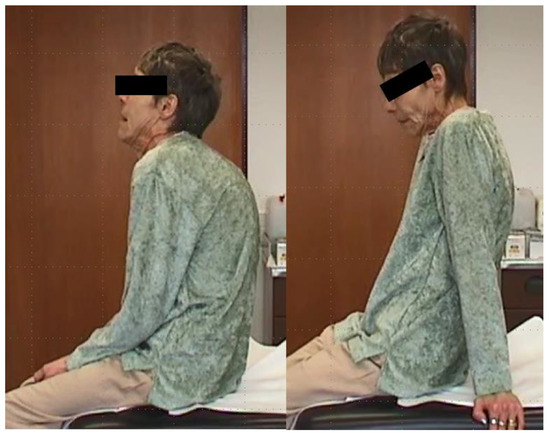 Wilson’s disease (WD) and segmental dystonia (patient 2). During upright sitting, shoulders were pulled forward, and the head was drawn back and downwards (left side). When she leaned back, shoulders could be moved back and the retrocaput component disappeared (right side).