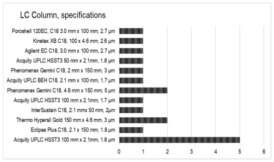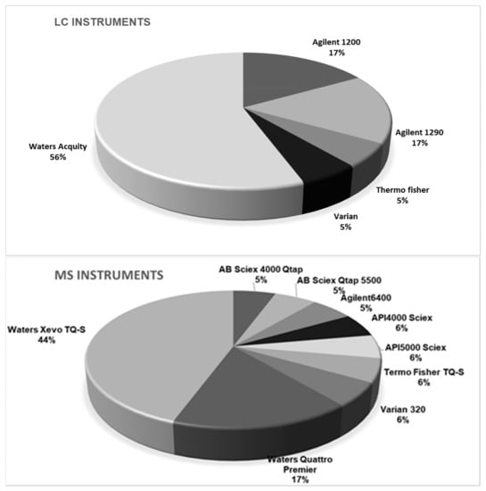 Taking into account the diversity of instrumentation available in the laboratories, participants were free to adapt their own instrumental setup, meaning a choice of LC columns, mobile phases, and MS parameters. Conditions and MS settings of the method as achieved by participants are summarized in Figure 2. Five generations of LC instruments equipped with nine models of MS instruments and 12 different LC columns were engaged. The application of high resolution MS was accepted, but none of the participants used this technique in the method validation study. One could argue that the diversity of the instrumentation used by participants was additional proof of the applicability of the method.