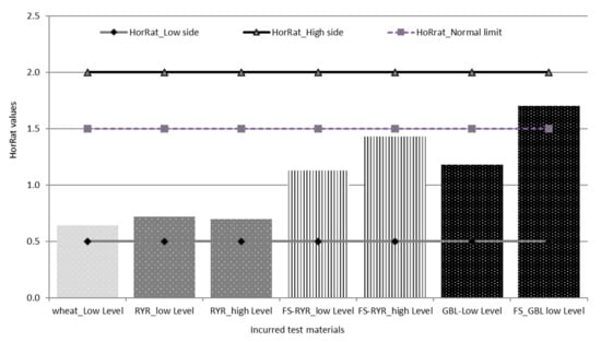 For the contaminated materials, the precision of the method was characterized by the repeatability (RSDr) and the reproducibility (RSDR) after the removal of outliers, as recommended in ISO 5725-2 [30]. The repeatability RSDr ranged from 6.4% to 14.6% and the RSDR from 10.2 to 37.3% (Table 4). All of the repeatability results fulfilled the EC regulation 519/2014, being below the maximum acceptable RSDr (%) = 0.66 × RSDR. HorRat values were below 2.0 (Table 4, Figure 3), indicating that good reproducibility was also achieved for the validated method. Note that the empirical acceptable ranges of HorRat 0.5–2.0 requested by Horwitz and Albert [31] have met and confirmed the validity of the analytical method of the present study.