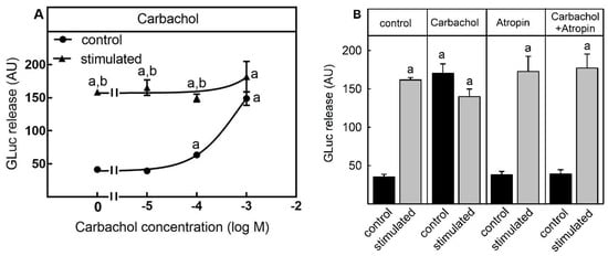 Muscarinic acetylcholine receptor: In two former projects, release of the reporter enzyme GLuc was stimulated by a high K+-depolarization buffer and entry of extracellular Ca2+ into the reporter cell line [10,11]. One aim of this study was to analyze if GLuc can also be released by a Ca2+-increase from intracellular pools. Muscarinic acetylcholine receptors, a member of class I, seven transmembrane G-protein-coupled receptors (GPCRs), comprise five distinct subtypes, denoted as muscarinic M1, M2, M3, M4, and M5 receptors [17,18,19,20]. Whereas M2 and M4 receptors are Gi-coupled and inhibit cAMP-formation, M1, M3 and M5 receptors are coupled to Gq and increased intracellular calcium concentration from the sarcoplasmatic reticulum via phospholipase C activation and IP3-formation. Carbachol, a non-selective muscarinic acetylcholine receptor agonist, increases intracellular calcium concentration and neurotransmitter release [21]. In line with this, carbachol provoked the release of the reporter enzyme GLuc from SIMA-hPOMC1-26-GLuc cells in a dose-dependent manner and the release was completely blocked by the muscarinic acetylcholine receptor antagonist atropine. At high concentrations, carbachol-mediated GLuc release reached the same level as GLuc release stimulated by high K+-depolarization.