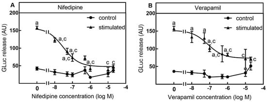 In line with the VGCC expression profile K+-depolarization-stimulated luciferase release was significantly inhibited by the L-type VGCC inhibitors nifedipine and verapamil which were used as antihypertensive agents [15]. Nifedipine inhibited luciferase release with an EC50 of 33 nM (Figure 4A). The inhibition was significant from 10 nM and higher, and maximal at a concentration of 10 µM (Figure 4A). Similar to nifedipine, verapamil inhibited luciferase release with an EC50 of 79 nM which was significant from 100 nM and higher, and maximal at a concentration of 10 µM (Figure 4B).