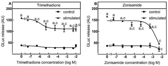 Inhibition of luciferase release by T-Type VGCC inhibitors. SIMA cells stably expressing hPOMC1-26 GLuc were cultured and differentiated as described in the methods section. After removing the medium, cells were washed with fresh medium and incubated in differentiation medium with different concentrations of T-type VGCC inhibitors trimethadione (A) or zonisamide (B) for 10 min. Cells were then incubated for three minutes with non-depolarizing (Na+, control) or depolarizing (K+, stimulated) balanced salt solution in the presence of different trimethadione (A) or zonisamide (B) concentrations. Cell culture supernatants were centrifuged, and luciferase activity was determined in the cell culture supernatants. Values are means ± SEM of at least three independent experiments. Statistics: Student’s t-test for unpaired samples, a: > control buffer without trimethadione or zonisamide: c: < control or stimulation buffer without trimethadione or zonisamide; p < 0.05.