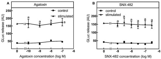According to their very low expression level, both the P/Q-type inhibitor agatoxin from the spider Agelonopsis aperta (Figure 7A) and the R-type VGCC inhibitor SNX-482 from the spider Hysterocrates gigas (Figure 7B) did not inhibit the luciferase release under control and stimulated conditions.