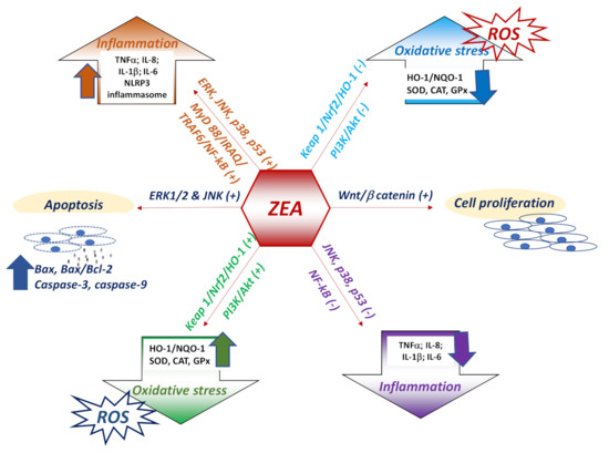 Nuclear factor erythroid 2–related factor 2 (Nrf2) is an essential regulator of antioxidant genes, and it is early activated in response to the oxidative stress [142]. Nrf2-mediated pathway is considered one of the mechanism responsible for the alteration of the antioxidant and inflammatory responses induced by ZEA at least at the intestinal level [28,143]. The activation of the Keap1–Nrf2 signaling pathway was observed after ZEA exposure and might contribute to the reduction of ZEA toxicity in immune cells and organs [141,142]. However, other studies have shown that zearalenone compromise the capacity of the organism to provide an adequate response to the oxidative stress, resulting in a downregulation of Keap1/Nrf2/HO-1 pathway [144] and of phosphoinositide 3-kinase (PI3K)/Akt signaling pathway related to Nrf-2 [145].
