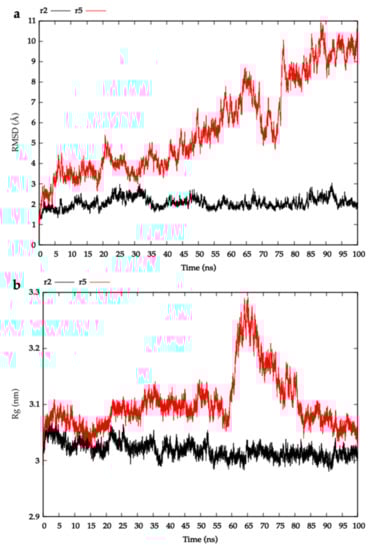 To assess the structural stability of docked models, the RMSD of the position of backbone atoms and Rg of models were analysed as a function of simulation time using GROMACS modules gmx rms and gmx gyrate. The Visual Molecular Dynamics (VMD, v.1.9.4) program was utilised to visualise simulations and the Gnuplot (v.5.2) program was employed to produce the graphics associated with this work [45].