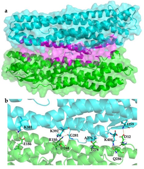 HblL1-HblB model r2. (a) the predicted dimer structure is illustrated showing HblL1 (cyan) and HblB (green) with the HblL1 beta tongue buried in the interface region (magenta); (b) polar interaction network via H-bonds and salt bridges as shown in Table 3.