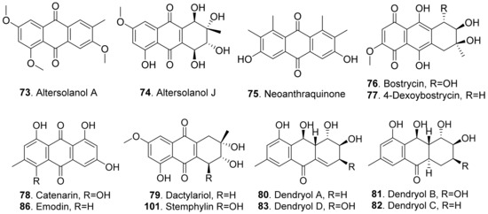 Two anthraquinones, namely altersolanols A (73) and J (74), were isolated from the pathogen Phomopsis foeniculi (teleomorph: Diaporthe angelicae) of fennel (Foeniculum vulgare). They showed a modulated phytotoxicity on the detached tomato leaves [75]. Altersolanol A (73) was also isolated from Alternaria porri. This compound inhibited growth of lettuce and stone-leek seedlings [76].