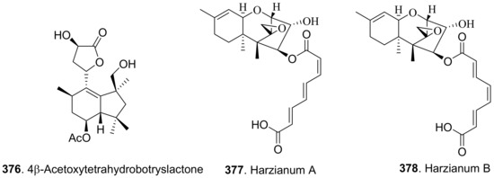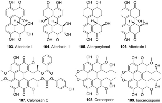 Many fungal dibenzo-α-pyrones possess a wide spectrum of biological activities such as cytotoxic, phytotoxic, and antimicrobial activities [42]. The structures of phytotoxic dibenzo-α-pyrones produced by the fungi from the genera Alternaria are shown in Figure 3.