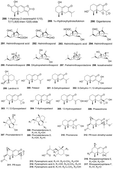 Spirobisnaphthalenes (also called bisnaphthospiroketals or spirodioxynaphthalenes) have a unique structure in which two napthalenes are connected by spiroketal or binaphalene spiroether. Most of these metabolites isolated from fungi exhibit significant phytotoxic, antimicrobial, and cytotoxic activities to show great potential applications in medicine and agriculture [70,71]. The structures of phytotoxic spirobisnaphthalenes from fungi are shown in Figure 10.