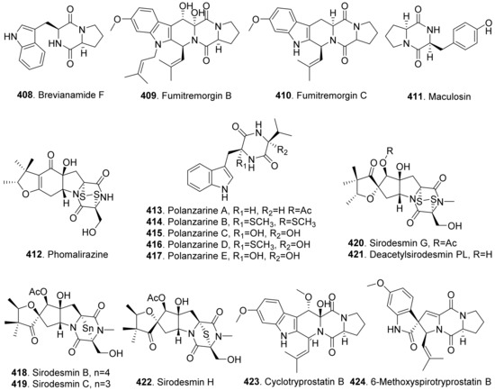 - Wang, X.; Li, Y.; Zhang, X.; Lai, D.; Zhou, L. Structrual diversity and biological activities of the cyclodipeptides from fungi. Molecules 2017, 22, 2026. [Google Scholar] [CrossRef]