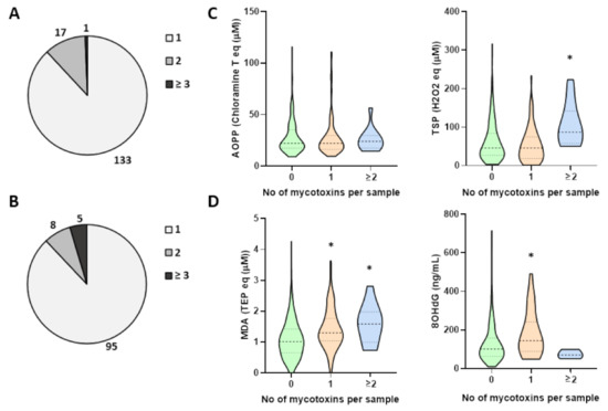Incidence of multiple mycotoxins in urine and serum samples and their correlation with parameters of oxidative stress. (A) Serum and (B) urine samples with 1, 2 or ≥3 mycotoxins per sample. Oxidative stress parameters measured in (C) serum as advanced oxidation protein products (AOPP) and total serum peroxides (TSP) and in (D) urine as malondialdehyde (MDA) and 8-hydroxydeoxyguanine (8OHdG). Dash lines in violin plots represent the median while the upper and lower dotted lines correspond to 1st and 3rd quartile, * significance p < 0.05 compared to control.