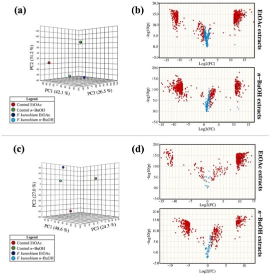 Principal component analysis (PCA) (x: log10 (FC), y: −log10 (p-value)) of EtOAc and n-BuOH extracts in electrospray ionization ESI+ (a) and ESI− (b) mode. Volcano plots of media inoculated with F. kuroshium compared to the control analyzed by UHPLC-MS-QTOF in ESI+ (c) and ESI− (d) mode.