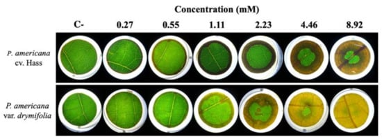 Avocado (Persea americana Mill.) leaves showing no damage were retrieved from one-year-old plants, cv. Hass and var. drymifolia. Avocado plants were obtained from a commercial greenhouse located in Uruapan in Michoacán, Mexico, and kept in semi-controlled conditions in an experimental greenhouse at 25 °C and 68% relative humidity (RH) in Cluster BioMimic®, INECOL. The phytotoxicity assay was performed as reported by Desjardins [52], with modifications. Leaves of each plant were surface disinfected in a 2% (v/v) solution of commercial bleach (NaClO) in sterile distilled water (dH2O), and circles of 15 mm diameter were then cut from the leaves and placed in 12-well plates containing 1 mL of 0.09% (w/v) of Murashige and Skoog medium (Phytotechnology Laboratories, Cat. M524) enriched with 1.5% (w/v) of sucrose in dH2O, pH = 7.00, plus the different treatments.
