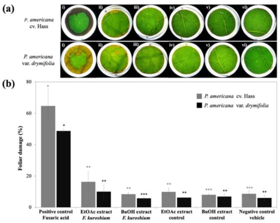 Phytotoxic effects (a) and foliar damage percentage (b) of F. kuroshium extracts tested on leaves of P. americana. (i) positive control 2 mM FA; (ii) EtOAc F. kuroshium extract; (iii) EtOAc control extract; (iv) n-BuOH F. kuroshium extract; (v) n-BuOH control extract; (vi) vehicle. Reported mean of three replicates (% ± SD). *, **, *** indicate statistically significant differences for each variety (p < 0.05).