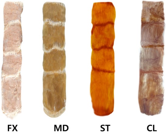 The rectus abdominis muscle underwent the modified Sihler’s method. The method consists of stages of fixation (FX), maceration and depigmentation (MD), decalcification, staining (ST), and clearing (CL).