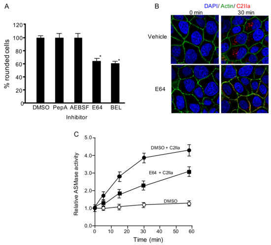 Inhibitors block C2 toxin-caused cytotoxicity in MDCK cells. (A) Cells treated with dimethyl sulfoxide (DMSO) (vehicle), 100 µM pepstatin-A (PepA), 100 µM AEBSF, 100 µM E64, or 25 µM bromoenol lactone (BEL) were then treated with C2I (250 ng/mL) and C2IIa (500 ng/mL) for 4 h at 37 °C. Approximately 100 MDCK cells were counted in microscopic photographs, and the percentage of round cells was evaluated. Values from four experiments are given as the mean ± standard deviation (SD). One-way analysis of variance was used to evaluate differences. * p < 0.01: significant difference compared to DMSO plus C2-toxin. (B) MDCK cells were pretreated with 100 µM E64 for 1 h at 37 °C, and treated with 500 ng/mL C2I and 1000 ng/mL C2IIa at 37 °C. After 30 min, MDCK cells were washed, fixed, and stained with anti-C2IIa antibody, 4,6-diamino-2 phenylindole (DAPI), and Alexa Fluor488-phallodin. C2IIa (red), actin (green) and nucleus (blue) were visualized by confocal microscopy. Representative images of three experiments are shown. Bar: 7.5 µm. (C) MDCK cells treated with DMSO or 100 µM E64 were incubated with C2IIa (500 ng/mL) for the indicated periods at 37 °C. Acid sphingomyelinase (ASMase) activity in the culture supernatant fluid was measured, as depicted in Materials and Methods. Intact cells utilized as controls were taken as a baseline level of 1.0. Results are shown as percentages of the values from intact controls. Data are mean values of four independent experiments ± standard deviations.