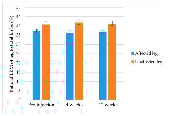 The ratio of LBM of the affected leg to total limbs significantly decreased at 4 weeks compared with preinjection (from 37.14% to 36.22%, p = 0.001) but significantly increased at 12 weeks compared with 4 weeks after injection (from 36.22% to 36.91%, p = 0.001). The ratio of LBM of the unaffected leg to total limbs increased significantly at 4 weeks after injection (from 40.88% to 41.83%, p = 0.001). No significant difference was found in the ratios of affected and unaffected leg to total limbs between before and 12 weeks after injection (Table 3, Figure 1). The ratio of the affected leg to the unaffected leg decreased significantly at 4 weeks after injection compared with preinjection (from 90.9% to 86.8%, p < 0.001) but increased significantly at 12 weeks compared with 4 weeks after injection (from 86.8% to 89.8%, p = 0.013). There was no significant difference between preinjection and 12 weeks after injection (90.9% vs. 89.8%, p = 0.151) (Table 4).