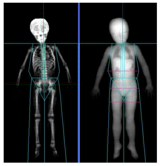 LBM was measured by DXA preinjection as well as at 4 and 12 weeks after injection. At each acquisition, LBM of the affected leg, unaffected leg, and both upper limbs were collected. All participants were scanned using GE Healthcare Prodigy densitometers (GE Healthcare, Madison, WI, USA) in a routine clinical manner, in accordance with the manufacturer’s recommendations. For Prodigy, Encore version 14.1 software (GE Healthcare) was used for the analysis and acquisition (Figure 2). As anatomical landmarks of the arms and legs, lines perpendicular to the axis of the femoral neck and angled with the pelvic brim and center of the arm socket were drawn. Soft tissue extending from the femoral neck to the toes and from the humeral head to the fingertips were included [25,30].