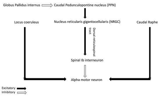 In human beings, the supraspinal impact on muscle tone and stretch reflexes is mainly modulated by the interplay (discussed later) of two inhibitory and two facilitatory descending tracts [10] (Figure 2).