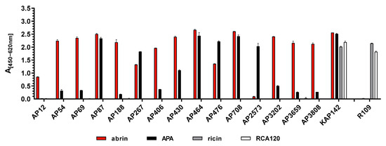 Specificity of monoclonal antibodies against abrin or APA in an indirect ELISA. Abrin (red), APA (black), ricin (grey) and RCA120 (white) were coated as antigens at 500 ng/mL each in 50 μL PBS containing 1 µg/mL BSA. The binding of the indicated monoclonal antibodies selected in this work (AP12 to AP3808 at 10 µg/mL) to the coated antigens was tested. For comparison and as a positive control, the polyclonal antibody KAP142 was used in parallel. As a negative control for abrin and APA, the monoclonal antibody R109 [46] was applied which specifically binds to ricin and RCA120 but does not detect the Abrus lectins.