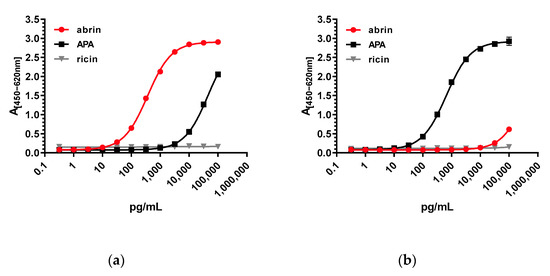 Regarding assay sensitivity, the two stationary ELISAs developed in this work delivered excellent detection limits: for the abrin-specific ELISA, an LOD of 22 pg/mL, and for the APA-specific ELISA, an LOD of ~35 pg/mL were determined. In comparison, previously reported ELISAs for abrin delivered detection limits between 100 pg/mL and 7800 pg/mL [31,32,33,34,57]; therefore, the current work significantly advances the field, offering tools with higher sensitivity as well as increased specificity and selectivity.