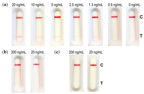 Performance of the abrin LFA for the detection of abrin spiked into buffer. The LFA was based on AP3808 as a capture antibody and colloidal gold labeled AP430 as a tracer antibody. For (a) abrin, 20, 10, 5, 2.5, 1.3, 0.6, and 0 ng/mL as final concentrations were used, whereas for (b) APA and (c) ricin, 200 and 20 ng/mL were tested. Abrin, APA and ricin were first diluted in 0.1% BSA/PBS followed by a 1:10 dilution in extraction buffer in accordance with the manufacturer’s instructions, and 100 µL was applied to the LFA. Results were read out after 30 min by the naked eye. C denotes the control line (anti-mouse capture antibody) and T denotes the test line (anti-abrin antibody).