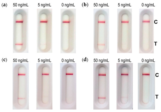 Detection of abrin in matrices using the abrin LFA. Two concentrations of abrin were spiked into (a) 0.1% BSA/PBS, (b) semi-skimmed milk and (c) a 10% (w/v) suspension of cat feces in 0.1% BSA/PBS, which were all further diluted with a 10-fold volume of extraction buffer resulting in the indicated final concentrations of abrin. (d) A 10% (w/v) suspension of sand in extraction buffer was spiked with abrin at 50 and 5 ng/mL and the sand was removed by centrifugation. Then, 100 µL of each solution was applied to the sample well. Results were read out after 30 min by the naked eye. C denotes the control line (anti-mouse capture antibody) and T denotes the test line (anti-abrin antibody).
