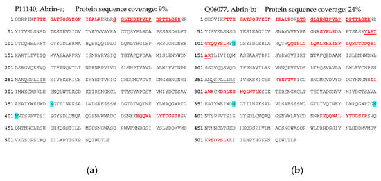 Protein sequence coverage of proteins identified in a human fecal sample from a suicide attempt after immuno-affinity enrichment, tryptic digest and non-targeting liquid chromatography coupled with electrospray ionization and tandem mass spectrometry (LC-ESI-MS/MS) analysis. Sequences of identified abrin isoforms (a) abrin-a (UniProt P11140) and (b) abrin-b (Q06077) are shown after a MASCOT server search against a self-assembled UniProt/NCBI database containing all abrin isoforms and Abrus precatorius agglutinin as well as an NCBI database containing all Abrus precatorius proteins. Amino acids highlighted in red were experimentally identified with a sequence coverage of 9% for abrin-a and 24% for abrin-b. Underlined peptides represent proteotypic peptides for (a) abrin-a or (b) abrin-b, respectively. Asparagine (N), highlighted in turquoise, represents potential N-linked glycosylation sites. The linker peptide sequence between the two chains of both abrin isoforms is underlined in black.